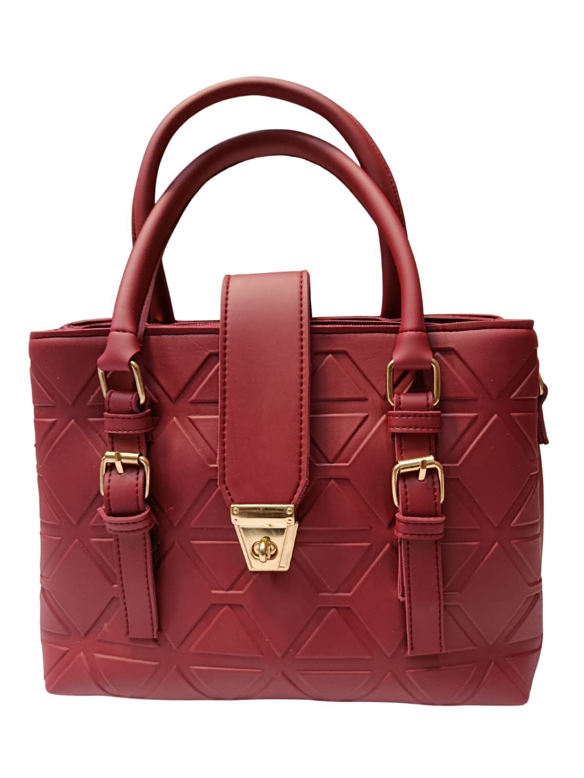 This elegant maroon shoulder bag is the perfect blend of modern style and everyday functionality. The bag’s sophisticated neutral color and embossed geometric pattern give it a high-fashion look that stands out. Its structured design ensures it maintains its shape, making it ideal for professional settings or a polished daily look.