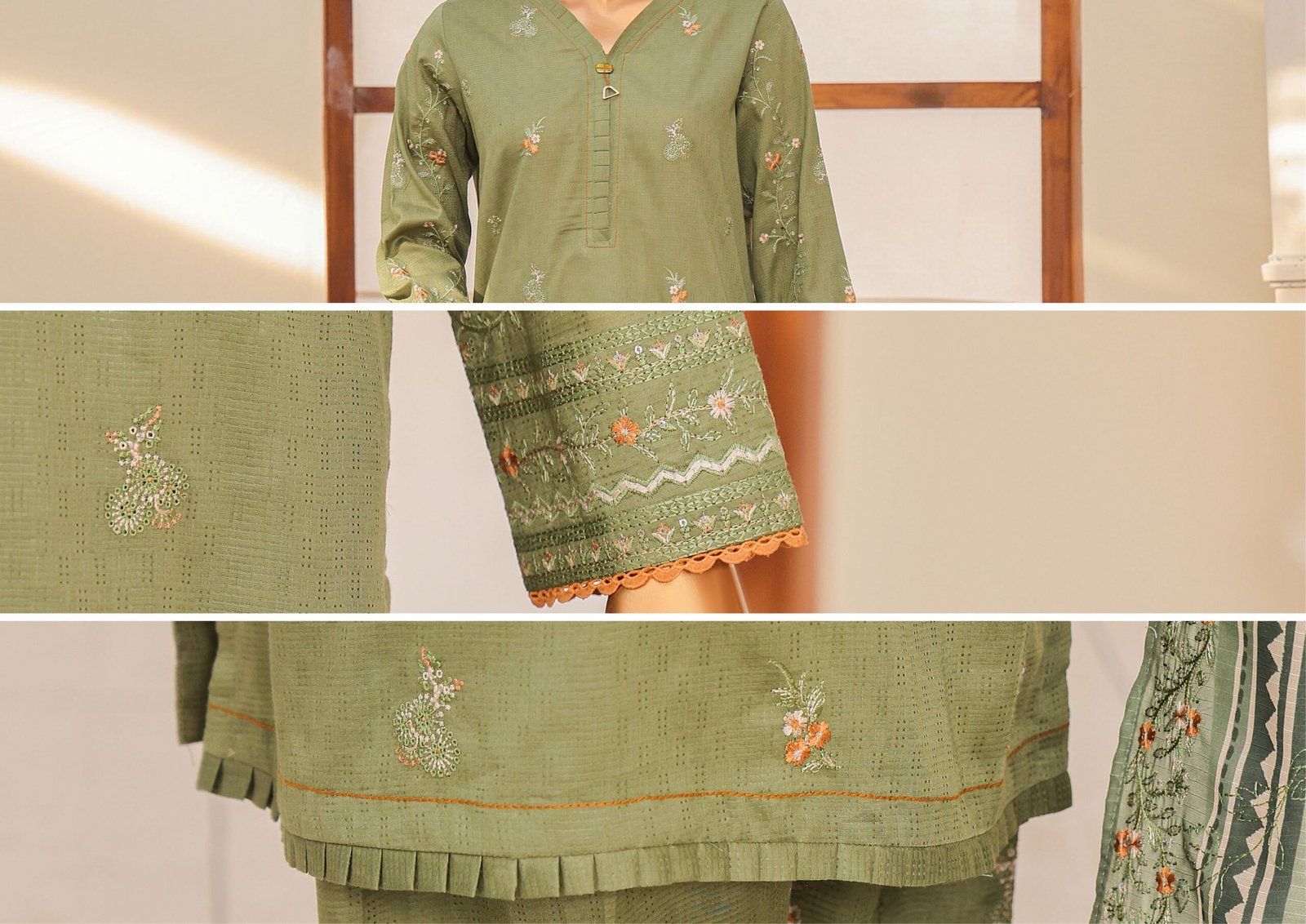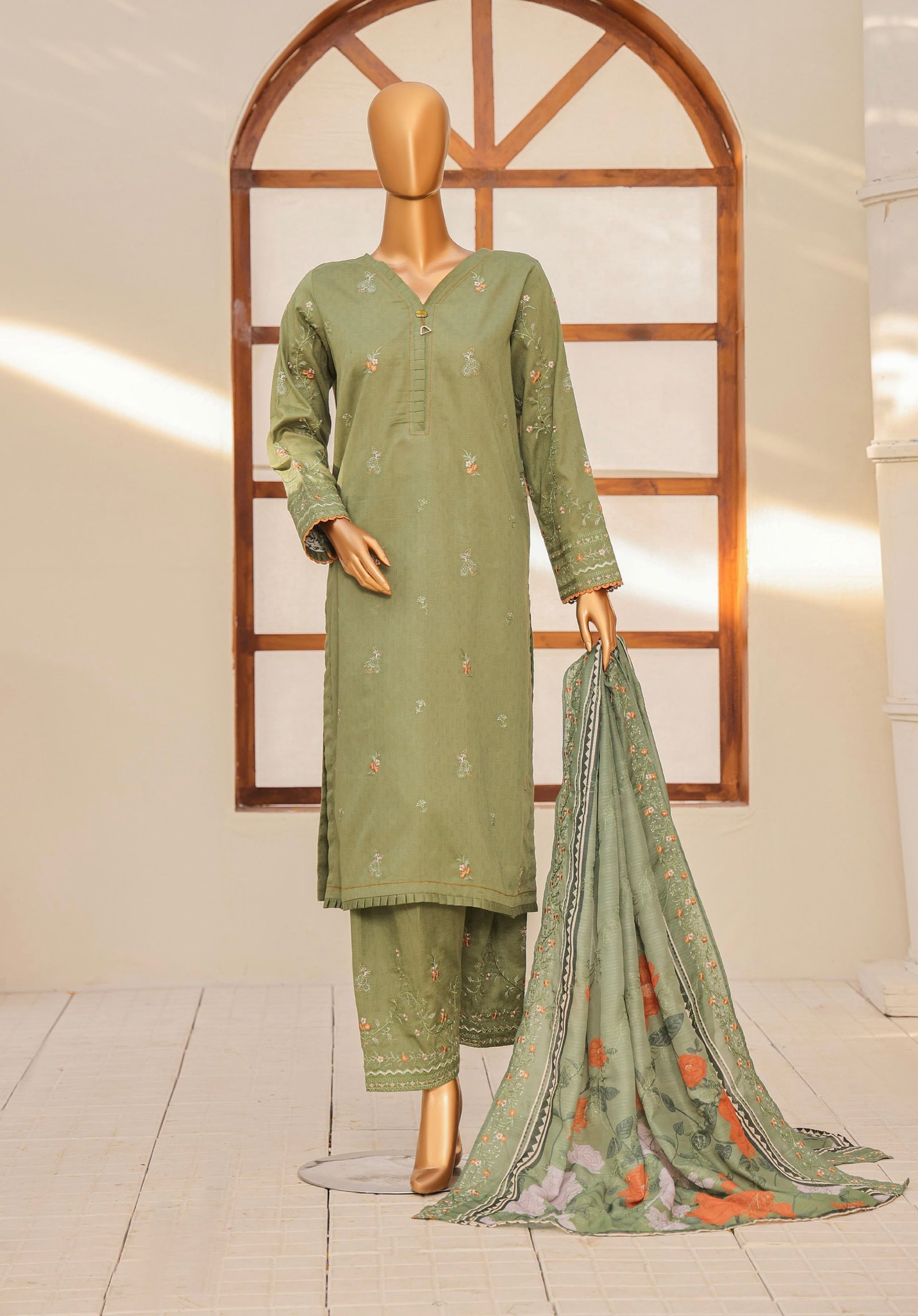 The dyed dobby heavy embroidered cotton shirt features exquisite embroidery that enhances its rich texture and gives a graceful, classy look. Paired with a digital printed fancy doria embroidered dupatta, the outfit adds a vibrant and elegant touch, creating a perfect balance of tradition and modern style. The look is completed with a dyed dobby embroidered trouser, ensuring comfort while maintaining a refined finish.