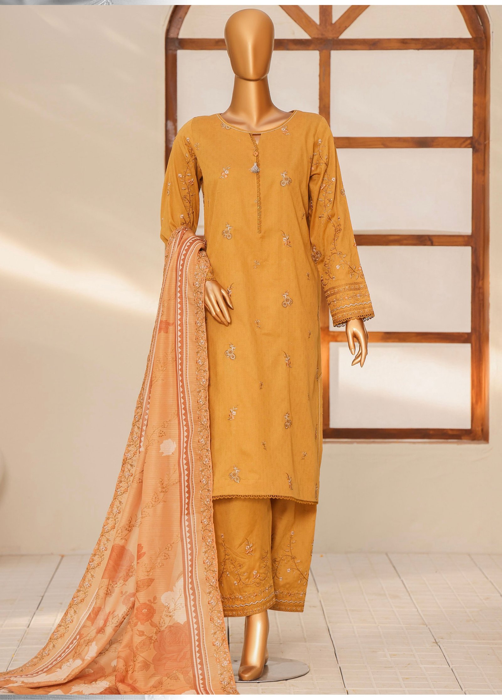 The dyed dobby heavy embroidered cotton shirt features exquisite embroidery that enhances its rich texture and gives a graceful, classy look. Paired with a digital printed fancy doria embroidered dupatta, the outfit adds a vibrant and elegant touch, creating a perfect balance of tradition and modern style. The look is completed with a dyed dobby embroidered trouser, ensuring comfort while maintaining a refined finish.
