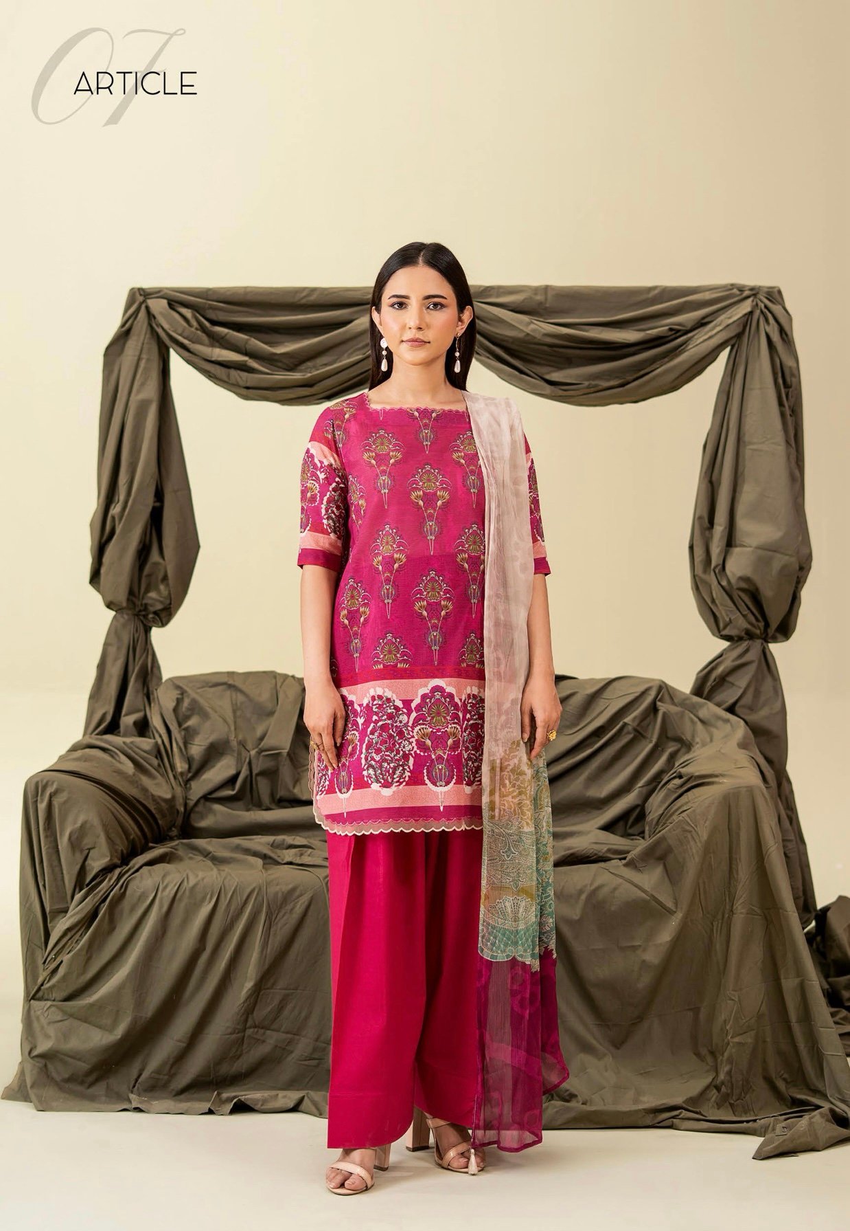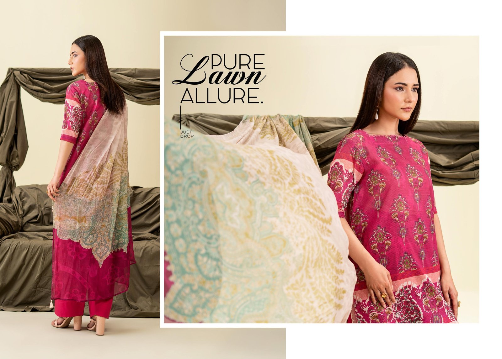 This 3-piece unstitched suit includes a beautifully crafted digital printed fancy lawn shirt for the front, complemented by a matching digital printed back and sleeves. The outfit is paired with a graceful digital printed Bamber chiffon dupatta, adding a soft, flowy touch to your overall look. Completing the ensemble is a dyed cambric cotton trouser, ensuring comfort and durability throughout the day.