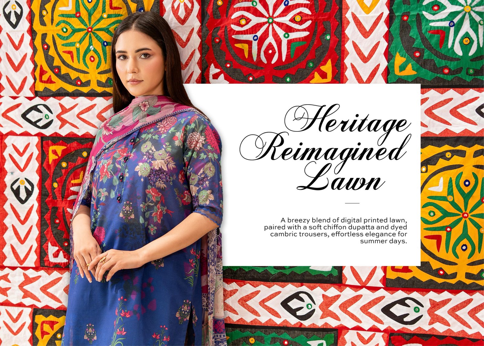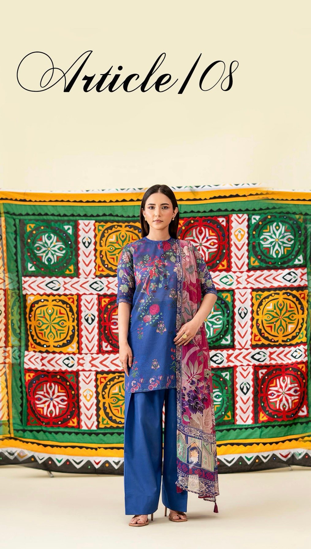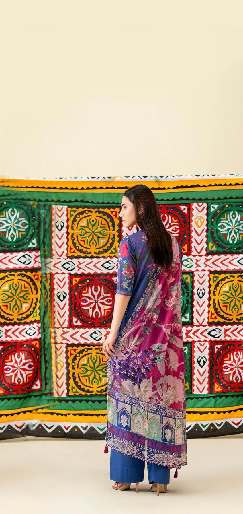 This 3-piece unstitched suit includes a beautifully crafted digital printed fancy lawn shirt for the front, complemented by a matching digital printed back and sleeves. The outfit is paired with a graceful digital printed Bamber chiffon dupatta, adding a soft, flowy touch to your overall look. Completing the ensemble is a dyed cambric cotton trouser, ensuring comfort and durability throughout the day.