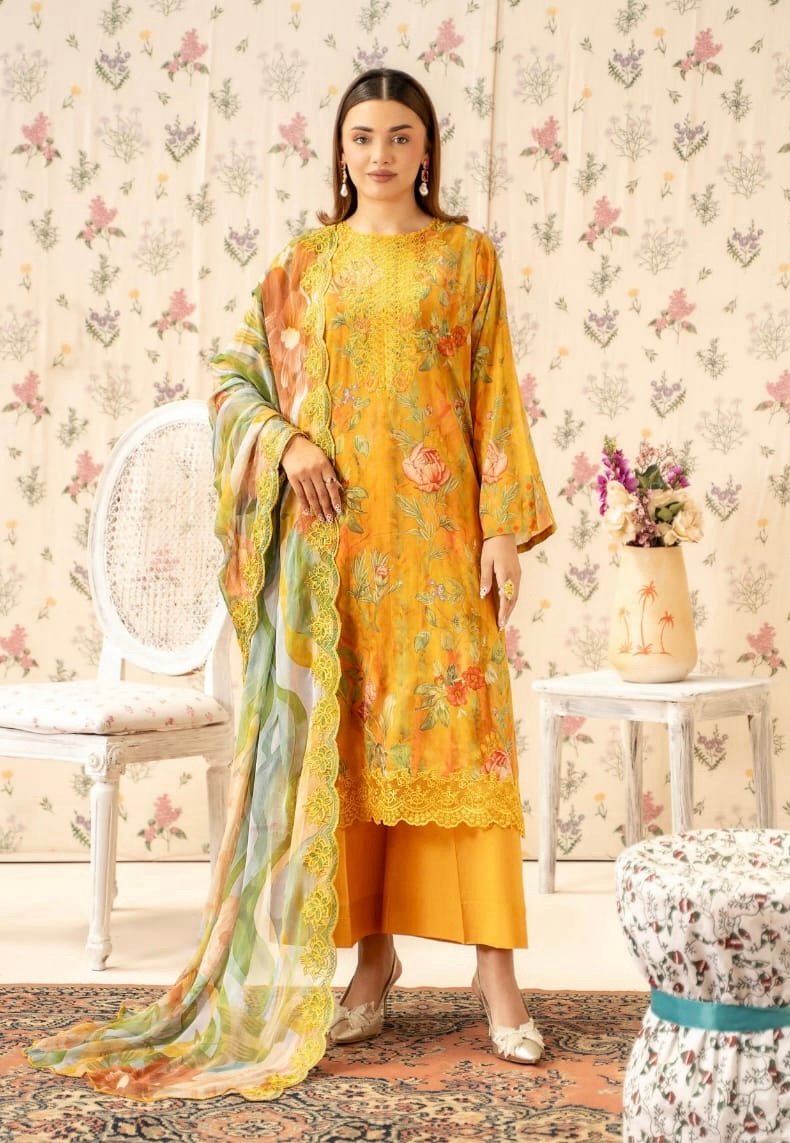 This exquisite 3-piece suit features a digital printed lawn front with intricate neck embroidery, enhanced with organza embroidered lace that adds a touch of luxury. The digital printed lawn back and sleeves perfectly complement the front design, creating a beautifully balanced look.