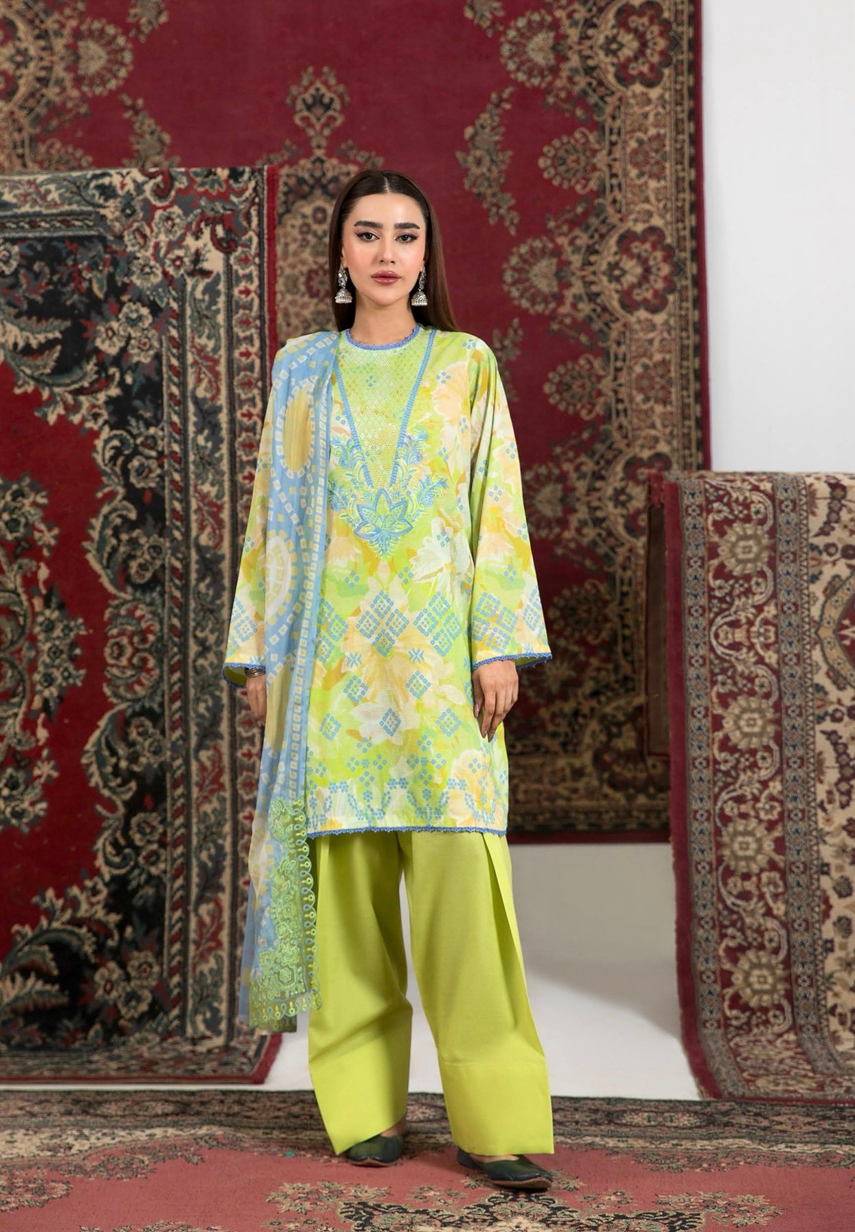 Enhancing the ensemble is a digitally printed Bamber chiffon dupatta, adorned with a 4-side organza embroidered bunch, giving it a premium and elegant finish. The suit is completed with a dyed cambric cotton trouser, ensuring comfort and durability for everyday wear.