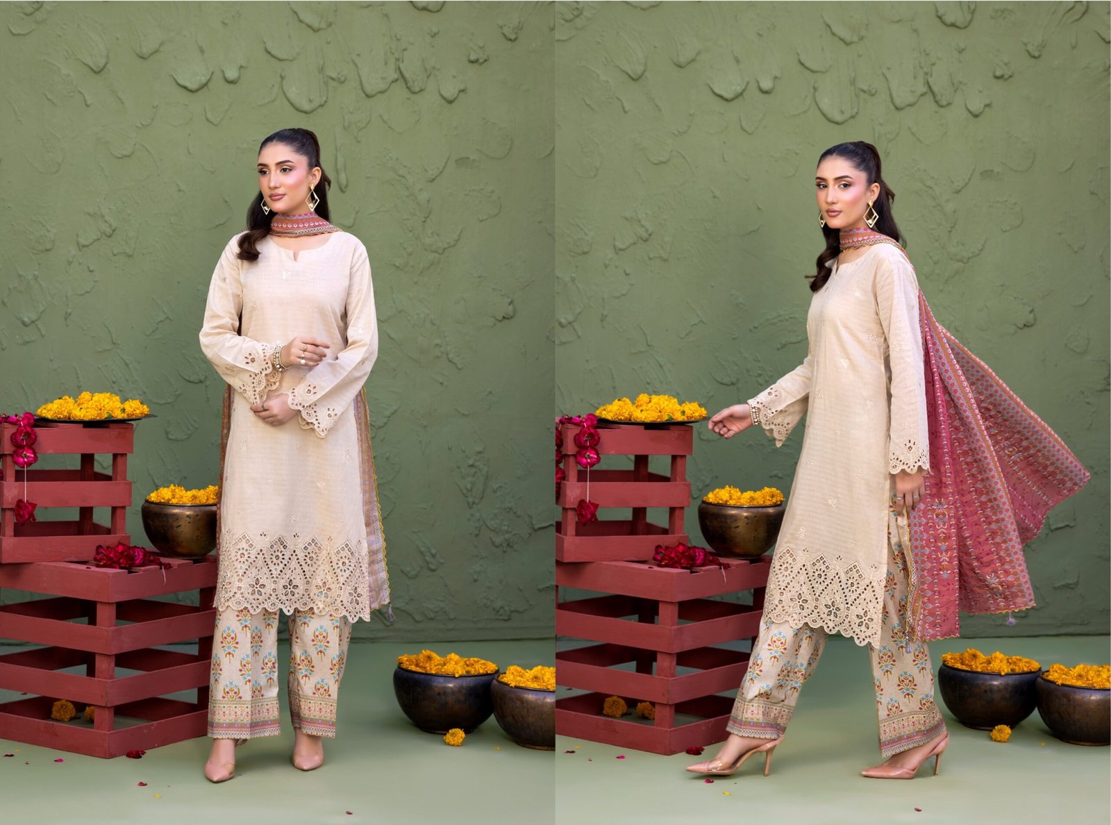 The outfit features luxury Rekha Chikankari web embroidery on the front, sleeves, and back, showcasing intricate artistry and a graceful finish. Paired with a fancy digital printed lawn dupatta, it adds a vibrant and stylish contrast to the ensemble. The look is completed with a digitally printed cotton trouser, ensuring comfort without compromising on elegance.