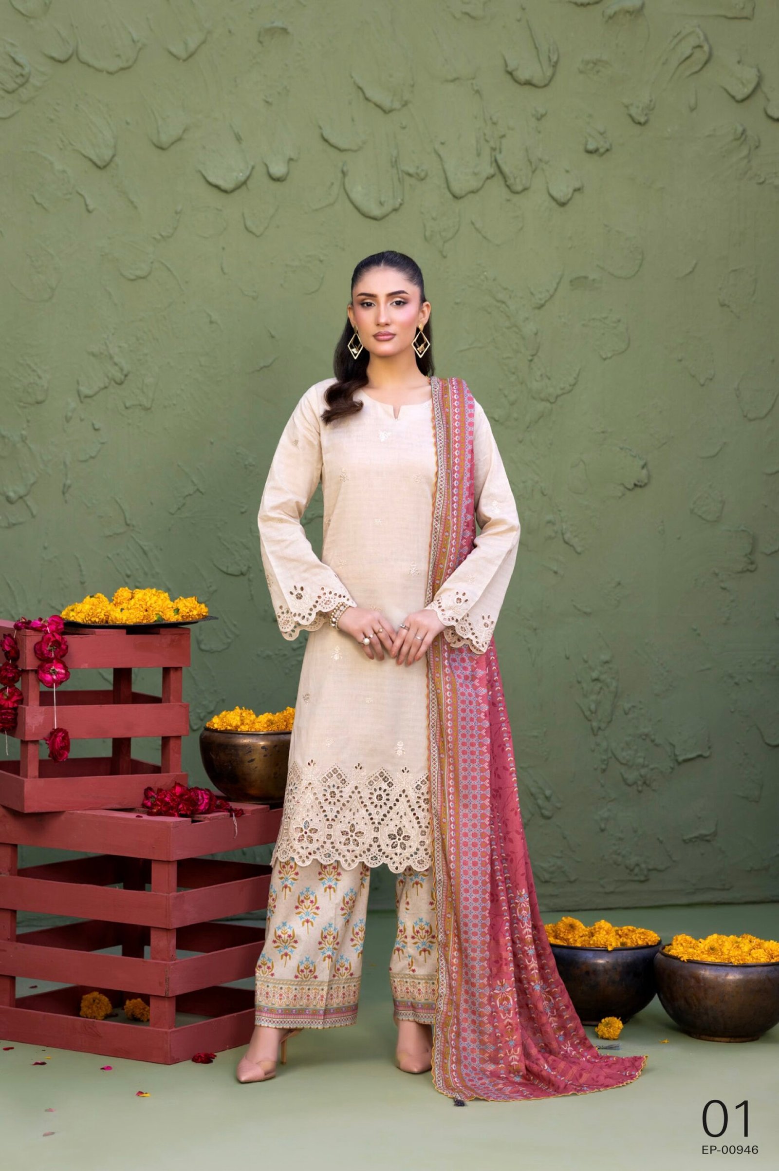 Rekhakari by ELAYA PRINTS is a luxury unstitched 3-piece suit featuring Rekha Chikankari web embroidery on front, sleeves, and back, paired with a fancy digital printed lawn dupatta and digital printed cotton trouser. A perfect choice for elegant summer and festive wear.