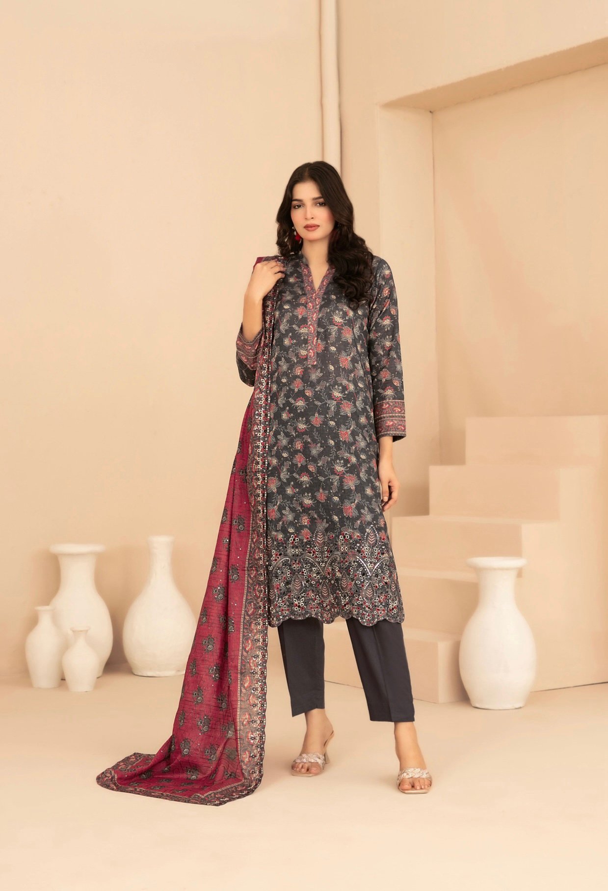 The outfit is paired with a stunning cutwork embroidered digital printed lawn dupatta, adding a graceful and premium touch to your look. Completing the ensemble is an unstitched plain cotton shalwar fabric, ensuring breathability and all-day comfort in warm weather.