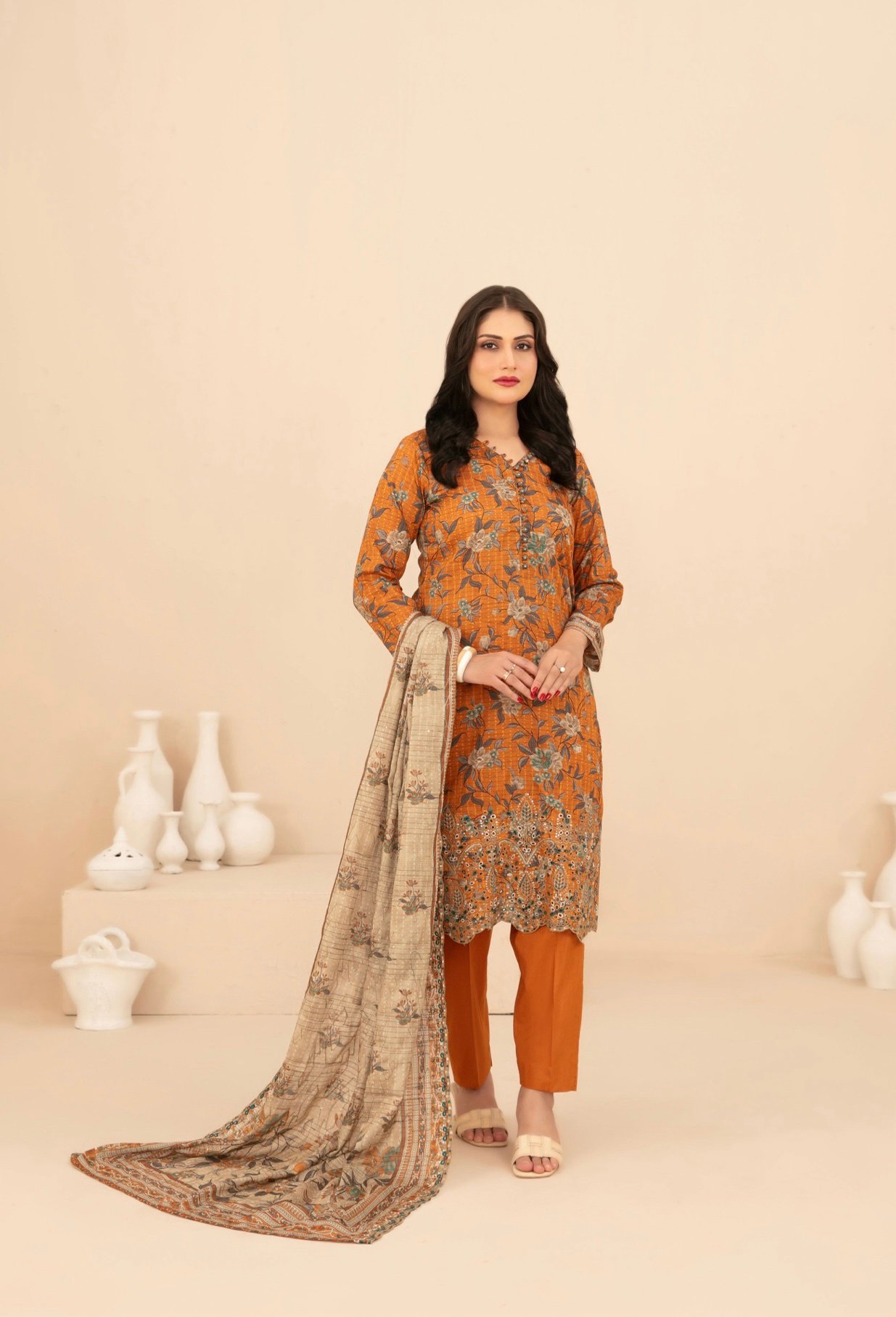 The outfit is paired with a stunning cutwork embroidered digital printed lawn dupatta, adding a graceful and premium touch to your look. Completing the ensemble is an unstitched plain cotton shalwar fabric, ensuring breathability and all-day comfort in warm weather.