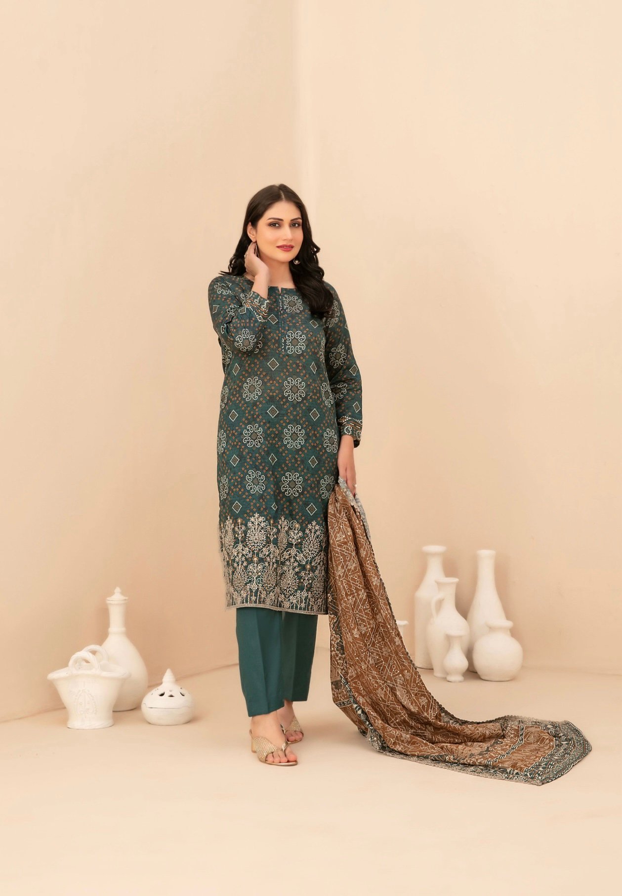 The outfit is paired with a stunning cutwork embroidered digital printed lawn dupatta, adding a graceful and premium touch to your look. Completing the ensemble is an unstitched plain cotton shalwar fabric, ensuring breathability and all-day comfort in warm weather.