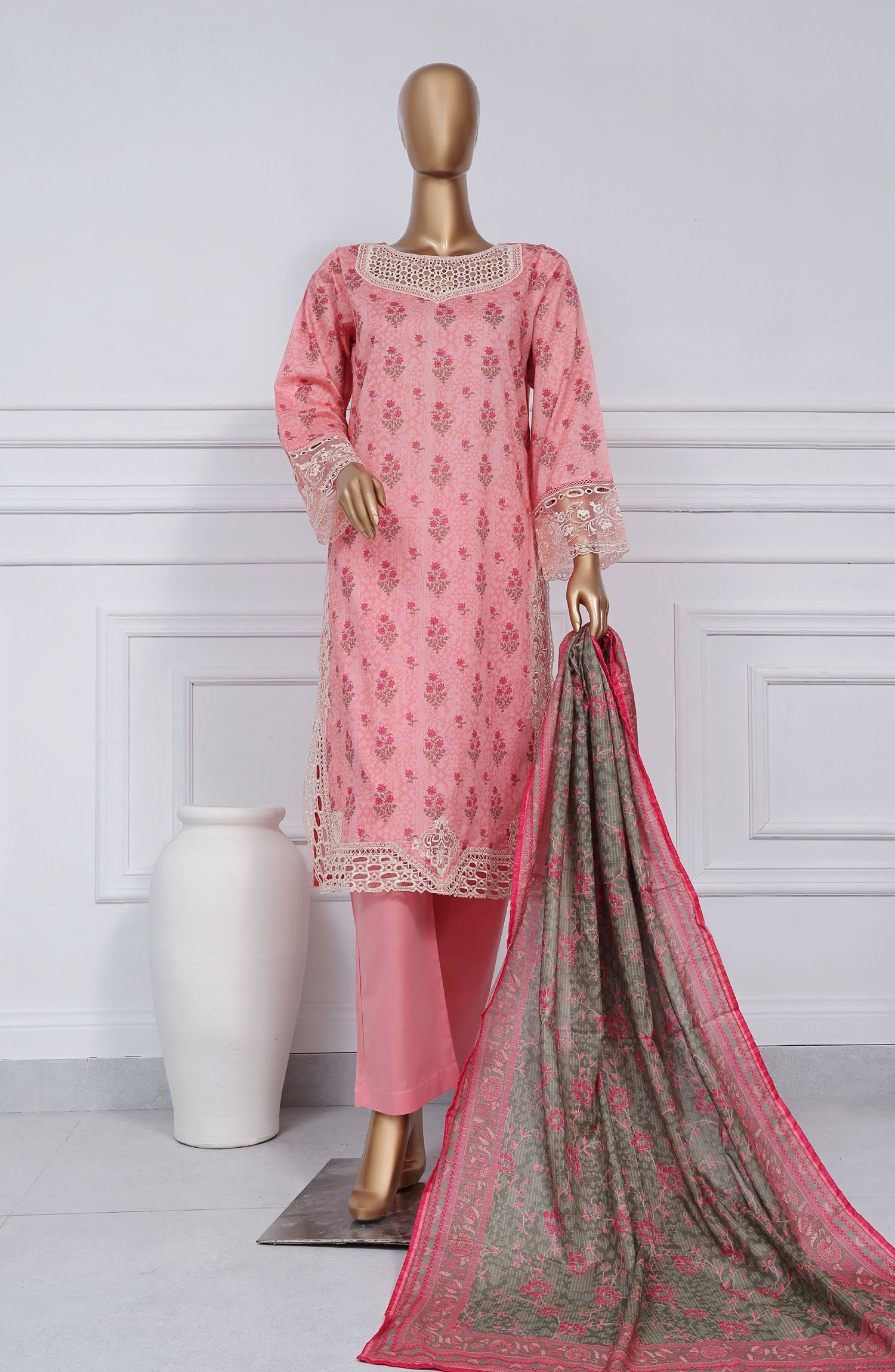 Sadabahar Luxury Cutwork Embroidered Lawn Stitched 3-Piece Collection – Elevate your style with this elegantly designed summer ensemble. Featuring a stunning printed and cutwork embroidered lawn stitched shirt, this outfit blends tradition with contemporary charm. The printed lawn dupatta adds a touch of sophistication, while the plain dyed stitched trouser ensures comfort and grace.