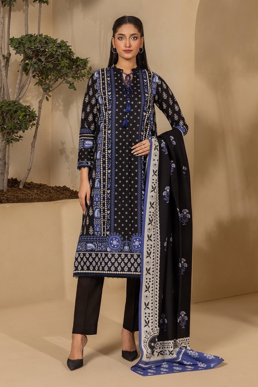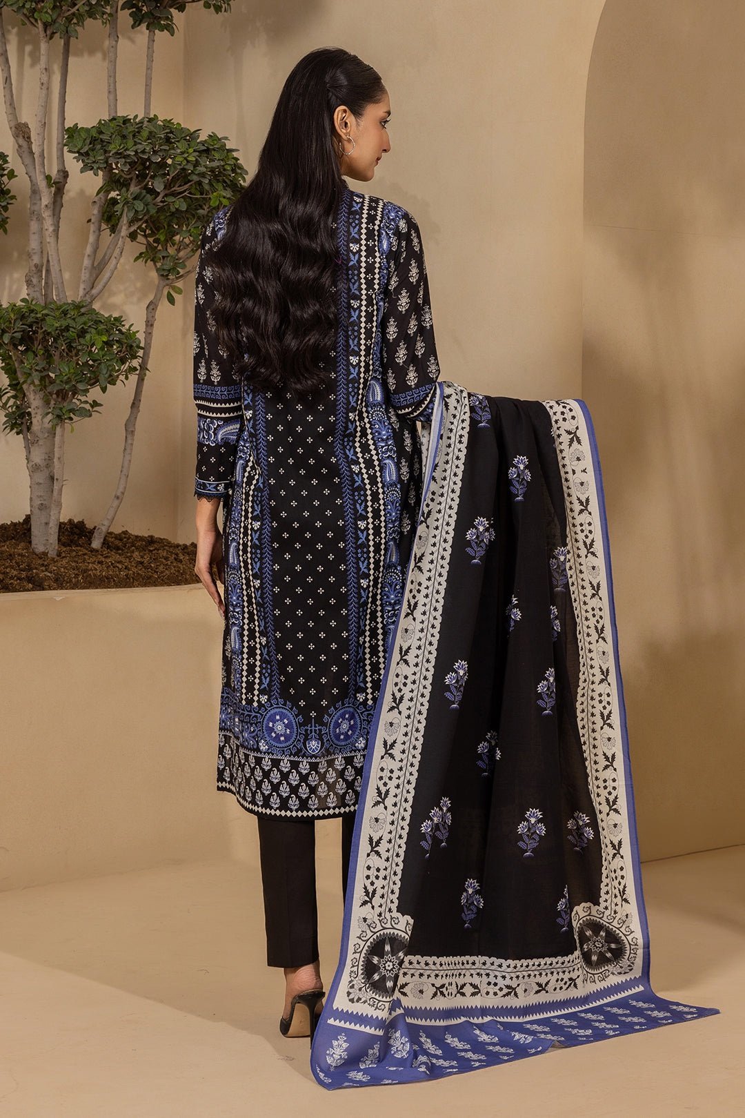 This 3-piece unstitched suit includes a digital printed slub lawn shirt (2.5 meters) that offers a soft texture and breathable feel. It comes with a matching digital printed slub lawn dupatta (2.5 meters), adding a vibrant and graceful touch to your look. The outfit is completed with a dyed cambric trouser (2.5 meters) for durability and all-day comfort.