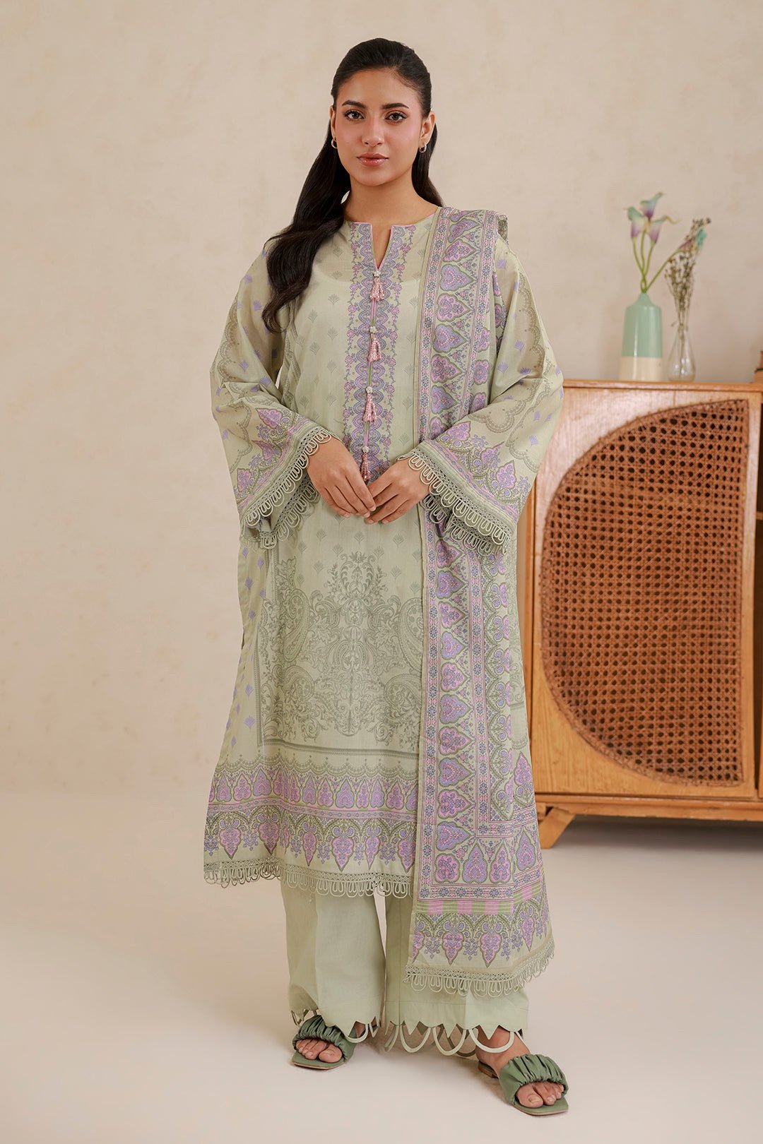 This 3-piece unstitched suit includes a digital printed lawn shirt (1.75 meters), ideal for a stylish and tailored fit. It is paired with a digital printed lawn dupatta (2.5 meters) that enhances the overall elegance of the outfit. The set is completed with a dyed cambric trouser (1.8 meters), ensuring comfort and durability for everyday wear.