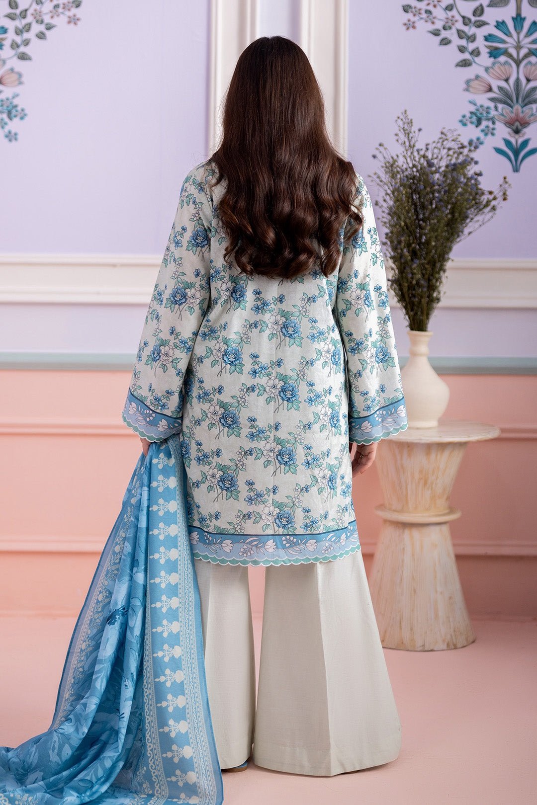 This 3-piece unstitched suit includes a digital printed lawn shirt (1.75 meters), ideal for a stylish and tailored fit. It is paired with a digital printed lawn dupatta (2.5 meters) that enhances the overall elegance of the outfit. The set is completed with a dyed cambric trouser (2.5 meters), ensuring comfort and durability for everyday wear.