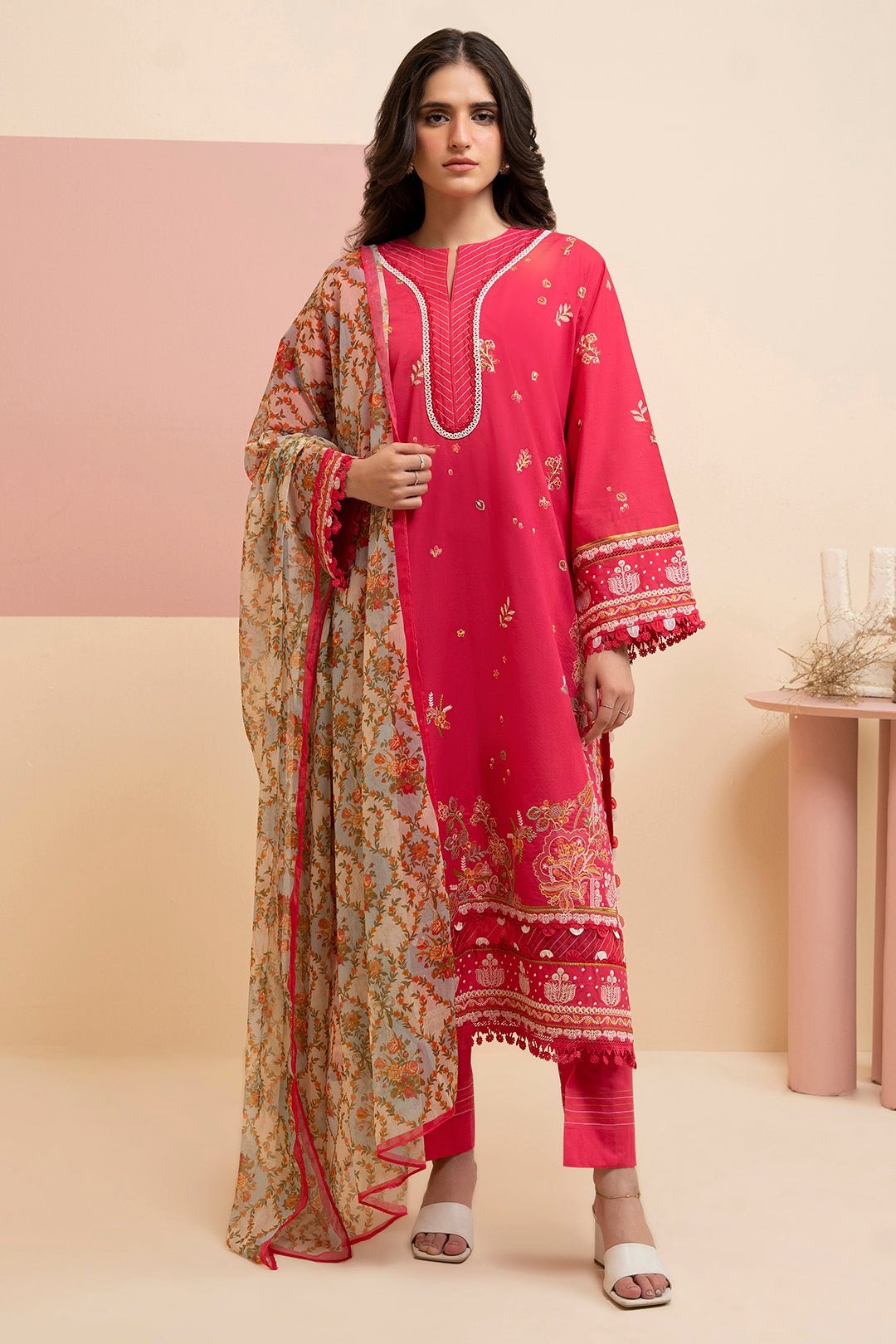 The embroidered lawn shirt brings sophistication, while the digital printed bamber chiffon dupatta adds a flowy, luxurious charm. Paired with a dyed cambric trouser, this unstitched 3-piece suit gives you endless styling possibilities to reflect your personal taste.